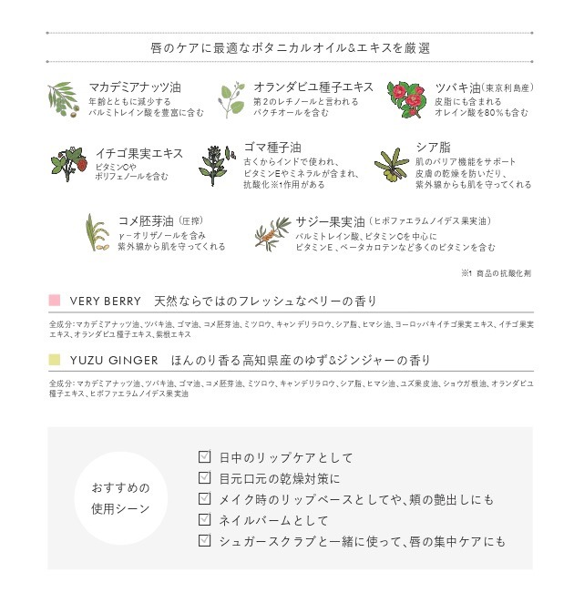 <ベリーベリー>マカデミアナッツ油、ツバキ油、ゴマ油、コメ胚芽油、ミツロウ、キャンデリラロウ、シア脂、ヒマシ油、ヨーロッパキイチゴエ果実エキス、イチゴ果実エキス、オランダビユ種子エキス、ムラサキ根エキス <ゆずジンジャー>マカデミアナッツ油、ツバキ油、ゴマ油、コメ胚芽油、ミツロウ、キャンデリラロウ、シア脂、ヒマシ油、ユズ果皮油、ショウガ根油、オランダビユ種子エキス、ヒポファエラムノイデス果実油 |
