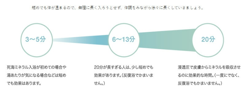 【毎日の入浴に適した量:40~100g】 ※浴槽200L~300Lに8割くらい注水時。これは温泉で言うと「単純温泉」くらいの想定です。 毎日のご入浴に十分な濃度です。 【死海ミネラルを高濃度温泉に近くする量:300g~400g】 ※浴槽200L~300Lに8割くらい注水時。濃度を好みに調整し、ゆっくり温泉のように楽しみます。 反復浴なども効果的。しかし「のぼせないように」注意が必要です。 【温度】 基本的にミネラルを皮膚から浸透圧により吸収させるためには38度程度が適していると言われますが、好みや体調に合わせて温度設定をしてください。しかし、汗をかき過ぎる高い湯温では、死海ミネラル浴の効果が減少するので、高すぎないようにしてください。 【時間】 短めでも体が温まるので、無理に長く入ろうとせず、体調をみながら徐々に長くしていきましょう。 【期間】 目的を持って温泉のように利用したい場合の期間と回数。より効果を期待する場合は、1~2週間1日に2~3回のご入浴がおすすめです。 その場合は「湯あたり」に注意して、少しでも気分が悪くなったら中止してください。 |